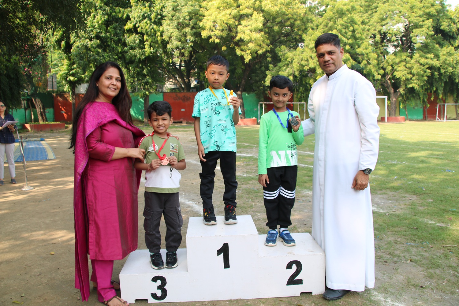 This was followed by various track events in which every child participated with great zeal and sportsmanship. A special highlight of the event was the grandparents’ race, which added a joyful touch to the day. The Sports Meet concluded with the prize distribution ceremony, where Rev. Father Roy, the Principal and Ms. Simmi Mahajan, the Primary Supervisor, presented medals to the winners. The event was filled with joy, energy and warmth, making it memorable for the students and grandparents.